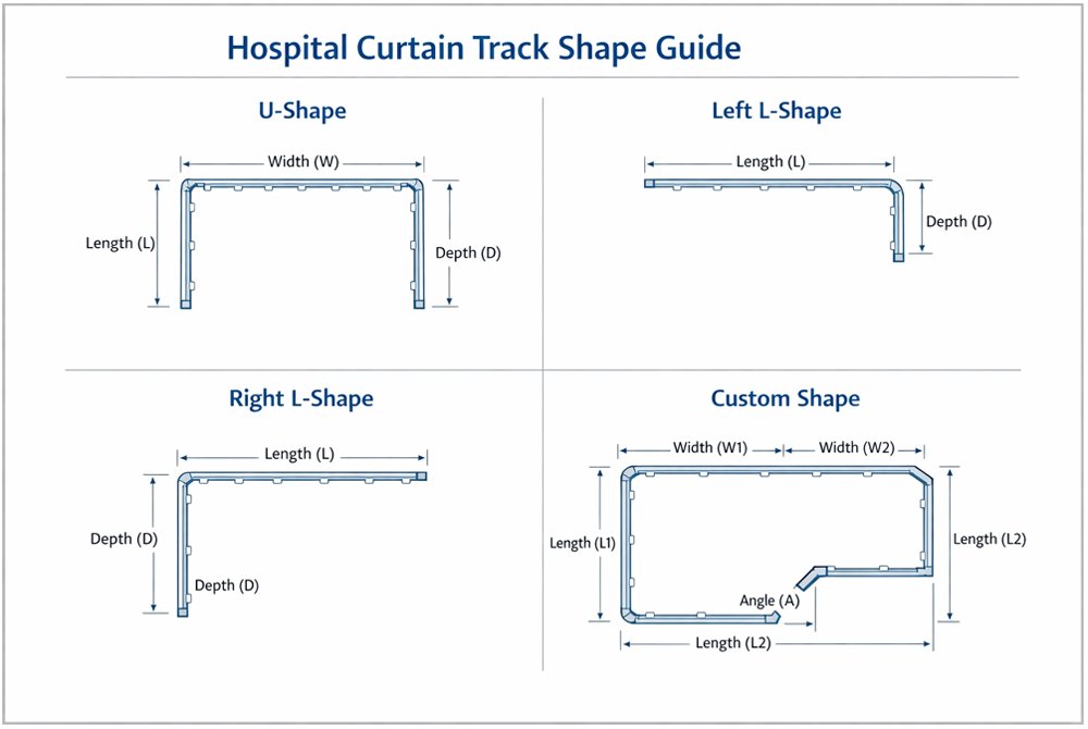 Правильный выбор формы направляющей обеспечивает не только плавное движение шторы, но и точное соответствие планировке помещения, расположению кровати и медицинского оборудования.